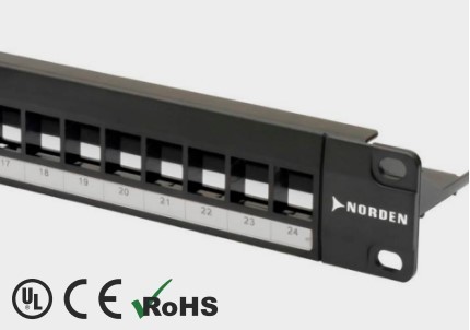 Blank UTP Punch Down patch panel from Norden exceeds TIA and ISO component specifications, supporting network convergence protocols, delivering maximum bandwidth and extended reliability for all LAN, multimedia, and Power over Ethernet applications. A rear cable management bar is supplied which acts as a stress reliever for terminated cables. All performance parameters, including NEXT, FEXT Attenuation and Return Loss are designed to meet the Cabling standard. The patch panel comes with mini cable ties, cage nuts and rear cable management bar as standard.